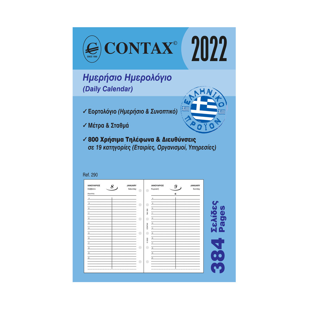 Το ανταλλακτικό ημερήσιο ημερολόγιο της Contax περιλαμβάνει: Εορτολόγιο, Μέτρα και Σταθμά, Χρήσιμα Τηλέφωνα και Διευθύνσεις.