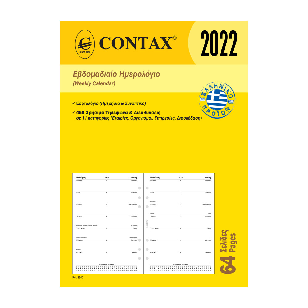 Το ανταλλακτικό εβδομαδιαίο ημερολόγιο της Contax περιλαμβάνει: Εορτολόγιο, Χρήσιμα Τηλέφωνα και Διευθύνσεις.