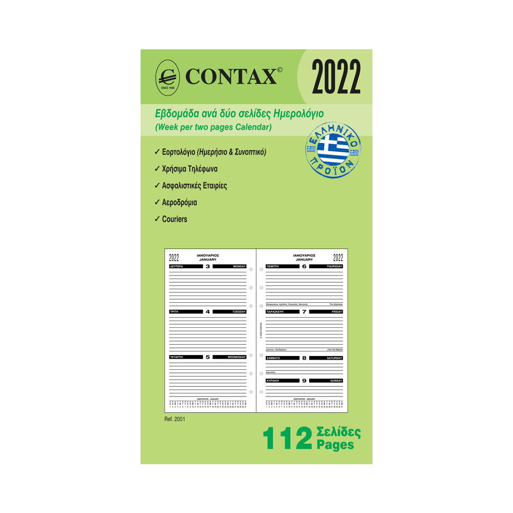 Το ανταλλακτικό ημερολόγιο με την εβδομάδα σε δύο σελίδες της Contax περιλαμβάνει: Εορτολόγιο, Χρήσιμα Τηλέφωνα, Ασφαλιστικές Εταιρείες, Αεροδρόμια, Couriers.